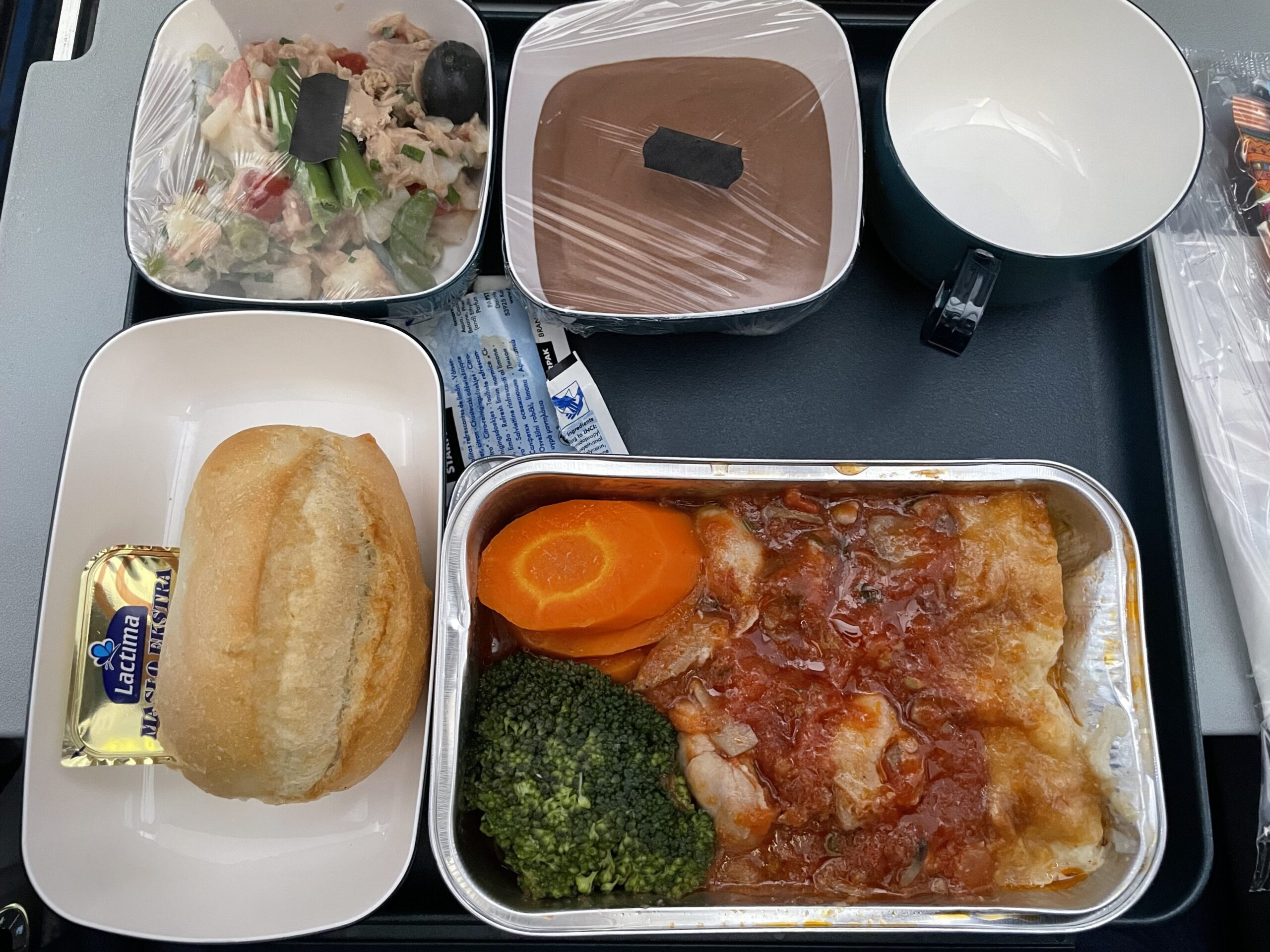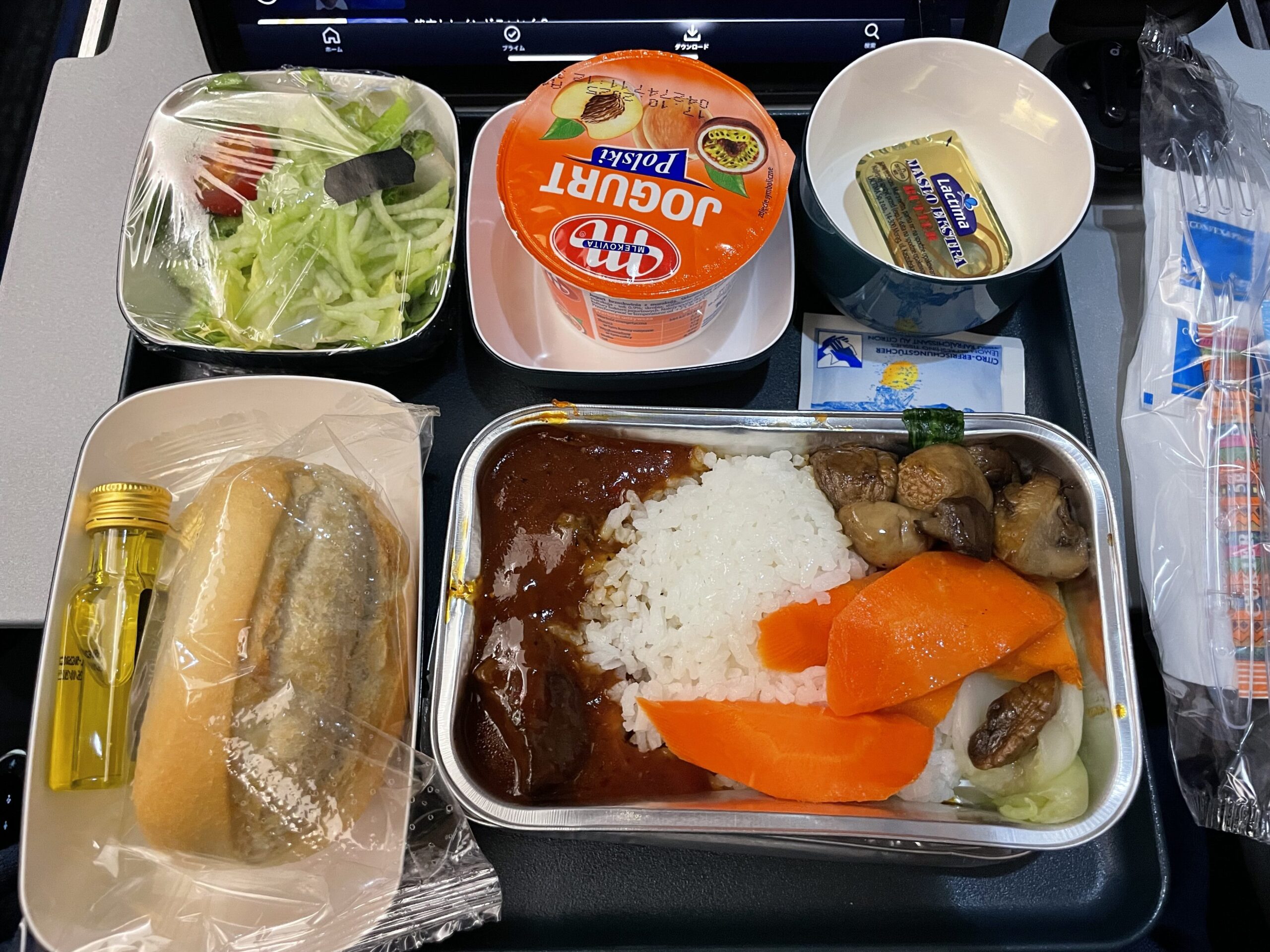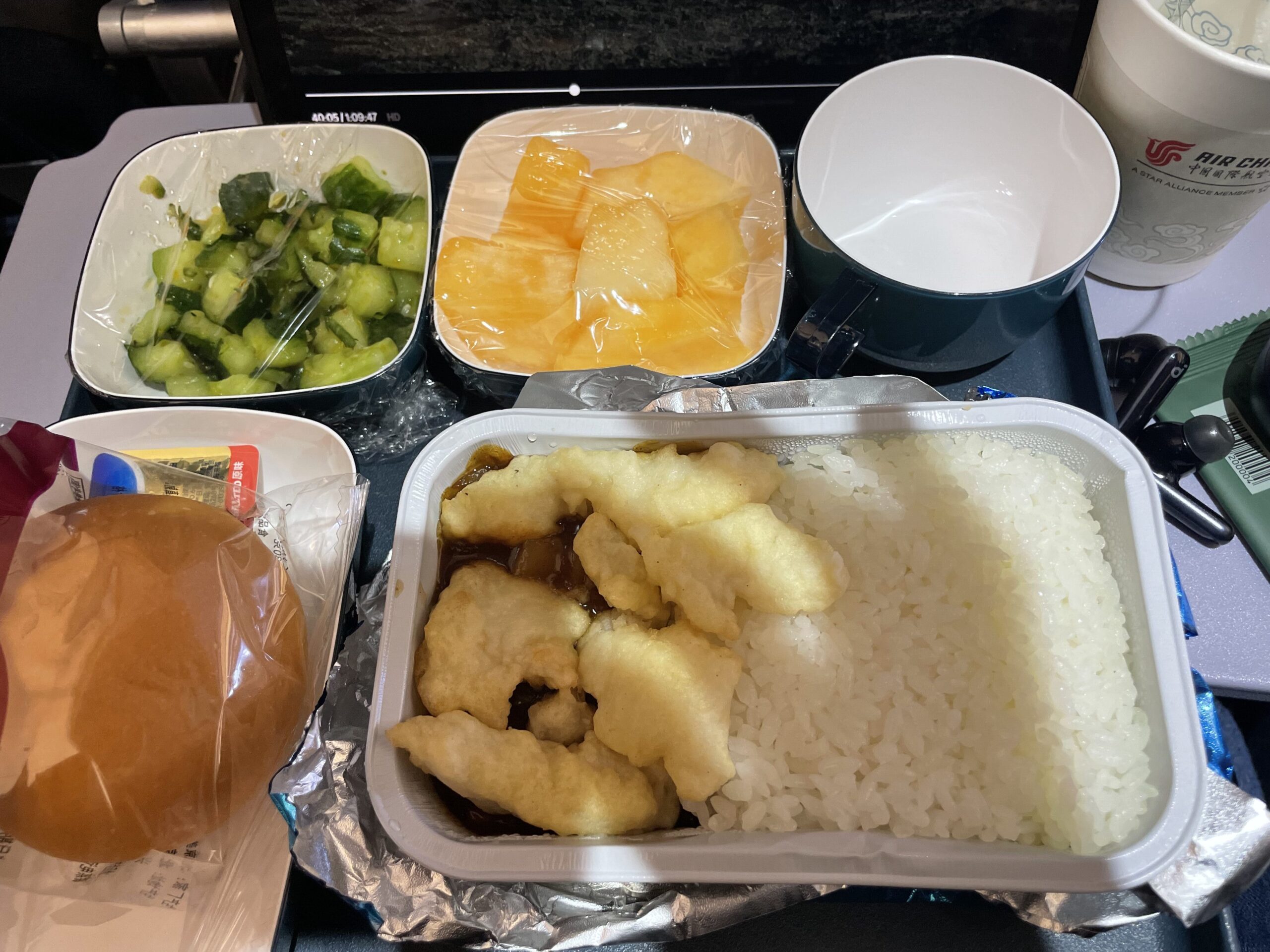 2回目の機内食は1回目の機内食から大体5時間くらいに提供されました。ビーフライスかチキンを選択。味もまずまず、美味しかったです!